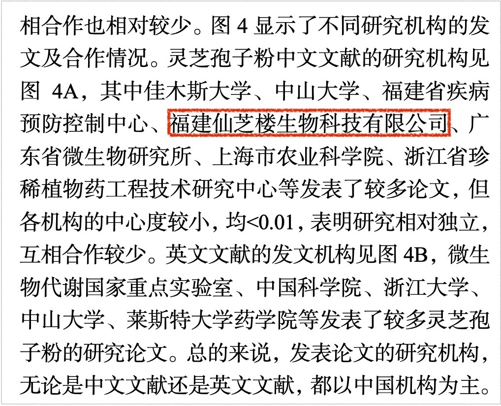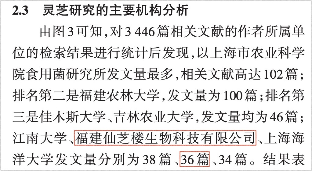 結(jié)果發(fā)現(xiàn),國內(nèi)的靈芝研究主要來自學(xué)術(shù)機(jī)構(gòu),也就是發(fā)文量前七多的機(jī)構(gòu)里,學(xué)術(shù)機(jī)構(gòu)就包辦了六家;入榜的私人企業(yè)只有一家,那就是福建仙芝樓生物科技有限公司。詳見以下文章截圖。