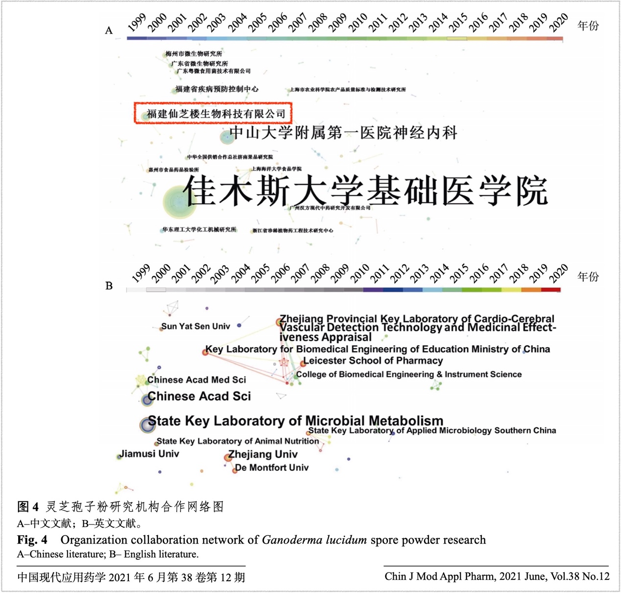 其中第二張圖,代表機(jī)構(gòu)的綠色圓點(diǎn)和機(jī)構(gòu)名稱字體越大,意謂發(fā)文獻(xiàn)量越多,而領(lǐng)先同行的“福建仙芝樓生物科技有限公司”就位居顯眼的位置。
